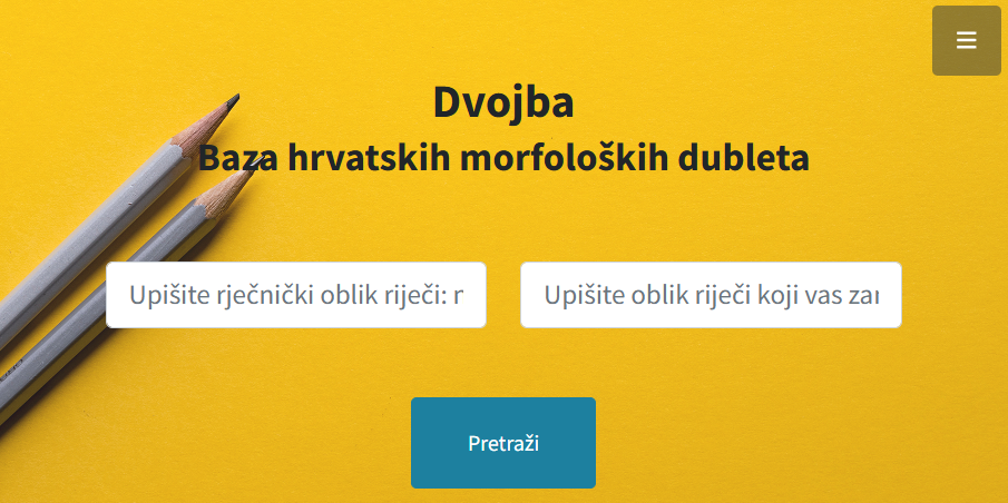 Na vrhu naslovnice pojavljuju se dva polja za pretragu: polje rječničkog oblika riječi (natuknice) i polje oblika riječi (pojavnice).