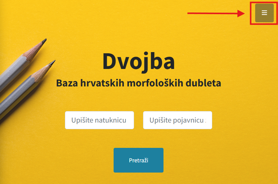Naprednoj se tražilici može pristupiti izravno na naslovnici pritiskom na ikonu ‘≡’ u gornjem desnom kutu naslovnice, kao na slici ispod, nakog čega se otvara izbornik. U izborniku potrebno je pritisnuti Pretraživanje.