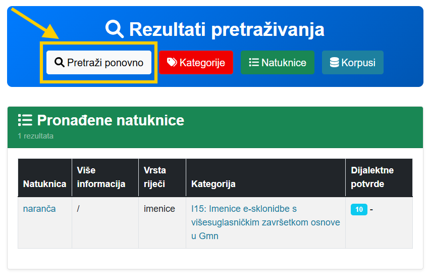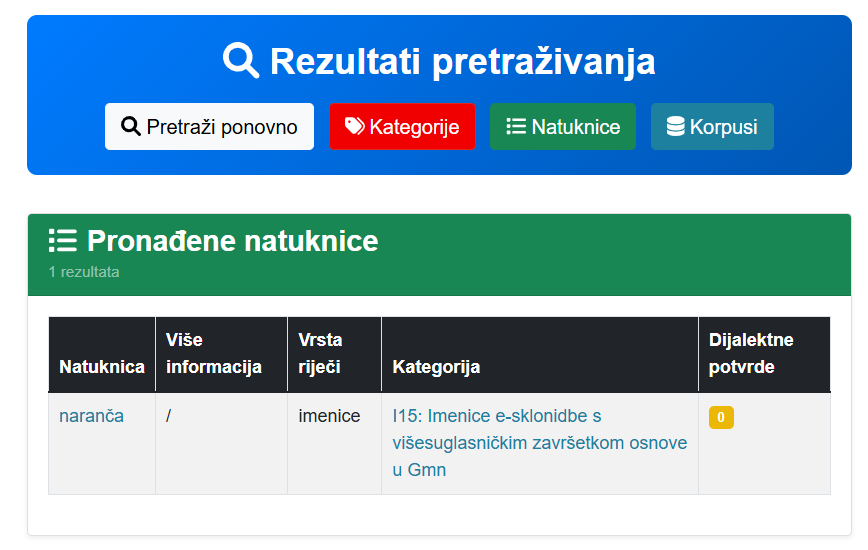 Pretraga vraća popis natuknica koje odgovaraju pretrazi (Pronađene natuknice). Uz natuknicu se navode napomene, informacija o vrsti riječi, kategorija dubletnosti kojoj pripada te eventualne dijalektne potvrde.